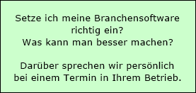 Mit unseren Leistungen ergänzen wir die Leistungen der Softwarehäuser um den fachpraktischen Teil des Betriebes. Unsere langjährigen, praktischen Erfahrungen sind dazu der ideale Nährboden für Ihren Erfolg.